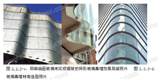 (2)、在異形幕墻的設(shè)計(jì)中由于單曲面弧形面板的適用范圍廣,面板曲面成型較容易;對(duì)幕墻的支承結(jié)構(gòu)體系沒(méi)有特殊的要求,特別是在異形玻璃幕墻的應(yīng)用中,由于單曲面玻璃可以進(jìn)行鋼化處理,大大提高了玻璃幕墻的安全度,所以單曲面弧形玻璃面板(詞條“玻璃面板”由行業(yè)大百科提供)常常使用在兩個(gè)平面幕墻的轉(zhuǎn)角過(guò)度造型、實(shí)現(xiàn)褶皺的造型效果、拼接成充滿韻律的異形墻面。在實(shí)際應(yīng)用中除玻璃材料外,各種金屬板材(詞條“金屬板材”由行業(yè)大百科提供)、GRC板、pc板、石材和各種人造板材也都大量采用單曲面弧形面板的形式作異形幕墻的面板材料。(如圖2.2.2-c、d)