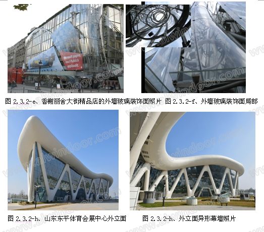 (3)、在玻璃幕墻的外立面上采用玻璃與玻璃之間有規(guī)律的折轉(zhuǎn)面,實(shí)現(xiàn)一種新穎的建筑效果,是建筑師常用的建筑藝術(shù)一種表現(xiàn)手法。北京的紅星美凱龍、愛(ài)琴海項(xiàng)目的立面異形點(diǎn)支式玻璃幕墻,就是采用三角片玻璃做有規(guī)律的帆面折線,使玻璃幕墻面能在光的反射下出現(xiàn)活、波靈動(dòng)的藝術(shù)效果。其結(jié)構(gòu)是在內(nèi)層幕墻外設(shè)置了一層鋼管支承結(jié)構(gòu),用點(diǎn)支式不銹鋼連接系統(tǒng)將結(jié)構(gòu)與面玻璃連接。(如圖2.1.2-f、g)