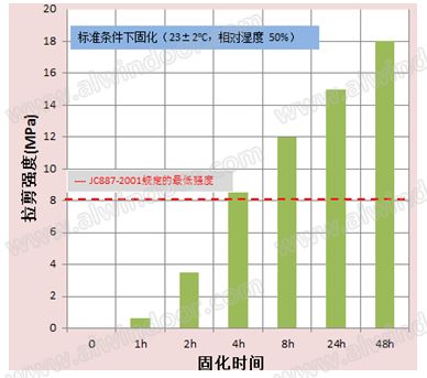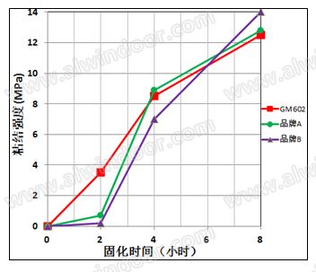 初期固化速度的比較 對于環氧干掛膠產品,評價性能的一個重要指標是固化速度。通常環氧膠達到完全固化狀態需要2-7天的時間。從提高施工效率的角度出發,初步固化時間(初固時間)作為固化速度的評價依據更有參考意義。現場施工中,受條件限制,用戶一般通過觀察膠的表干時間對固化速度做出估計。所謂表干時間即A、B膠從開始混合到指觸膠表面不粘手的時間間隔。這種評價手段雖然直觀但有較大的主觀性。因此除了表干時間,在衡量固化速度方面我們定義初固時間為(標準條件下養護)粘結強度達到2MPa和8MPa的時間。測試樣品采取膠搭接的不銹鋼-不銹鋼試件。從圖2可以看出,在固化的前兩個小時GM602的粘結強度提高最快,以平均~2MPa/h的速度增長。而品牌A、品牌B的粘結強度這一時間增長緩慢,直到2h后才開始明顯提速。值得注意的是三種膠達到8MPa粘結強度的時間基本相當。表3對三種膠的初步固化時間做了歸納。表干時間方面GM602為35~40min比品牌A和品牌B分別縮短了10min和20min。綜合三項指標,GM602的固化初速度表現是優秀的。圖3是GM602粘接強度隨時間(48h內)的變化情況。可以看到4h即可達到JC 887-2001規定的最低強度(8MPa),8h可達到完全固化強度的60%,24h可達到完全固化強度的75%,48h可達到完全固化強度的90%。