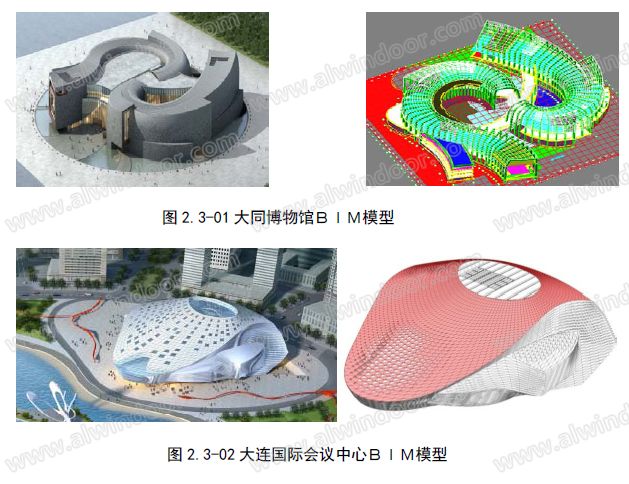 復雜外皮、弧面3D空間交接外皮,對設計、制作和安裝提出了高標準要求。圖2.3-01、2.3-02是復雜體型典型代表,其共同特點是外皮采用曲面等復面,交接處多、構件尺寸多而異型,針對這樣的項目,采用建筑信息化模型設計工具(BIM技術平臺)能有效地化解設計問題,既通過建模、現場測量與合模、四維虛擬模擬施工工藝等方法,在施工前解決所有技術問題,為一次性施工,減少返工創造條件。