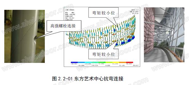 圖2.2-01中反映“東方藝術中心”實施時研究的現場高強度螺栓抗彎連接技術,連接位置要設于構件在荷載作用下產生的彎矩較小的位置(如圖2.2-01),這樣可以避免構件對連接處的過高工藝要求。這種工藝對設計超長構件,具有較高指導意義。