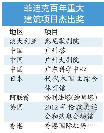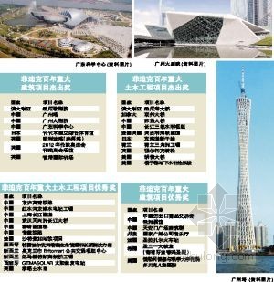 菲迪克此次在全球范圍內(nèi)評選了“百年建筑”、“百年土木工程項(xiàng)目”和“百年杰出咨詢工程師”三項(xiàng)大獎。其中最高獎“菲迪克百年重大建筑項(xiàng)目杰出獎”頒給了8個(gè)建筑,廣州占了3個(gè),分別是廣州大劇院、廣東科學(xué)中心、廣州塔。(詳見上表)