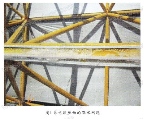 工程介紹:某采光頂建筑在2O11年5月開始進行施工建設,選用993建筑采光頂用高性能硅酮密封膠進行采光頂屋面玻璃板片的接縫密封,于2O12年9用竣工交付使用。一般情況下,采光頂工程質保年限在1O~15年之間。但是截至2O14年5用,該采光頂屋面已經發生多次大面積漏水,且多次修補無效(圖1)。