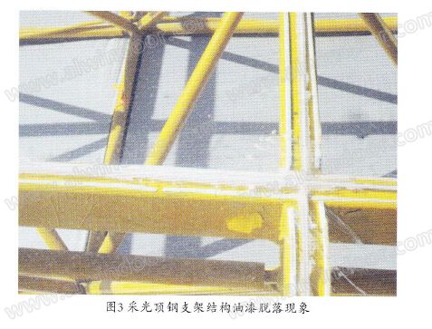 該工程除了漏水以外,還存在比較重大的安全隱患:采用993粘結玻璃板片和鋼支架結構,993是一種耐候膠不能作為結構粘結使用,存在使用部位不當。另外是由于鋼材表面在現場進行刷漆操作,油漆層容易脫落銹蝕,實際上玻璃并沒有進行有效粘結固定(詞條“固定”由行業大百科提供),而是放置在鋼支架結構上,當環境中的風力較大時,采光頂很容易被吹掉造成安全事故。目前,該工程的油漆已經有脫落現象發生(圖3),讓人很是擔心該工程的安全性。針對該工程實際出現的漏水問題和安全隱患,只有把整個的采光頂全部拆掉,重新按照要求設計規范圖紙,進行標準的施工才能夠從根本上解決問題。