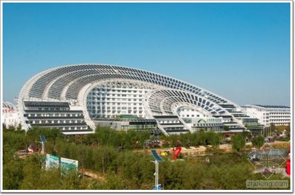斗拱造型的中國國家館被譽為“東方之冠”。夏季,頂層建筑可以為底層建筑遮陽,起到一定的降溫作用。另外應(yīng)用了生態(tài)農(nóng)業(yè)景觀技術(shù),能有效隔熱,使建筑能耗降低25%以上。世博中心設(shè)計遵循“3R”原則,大力增強建筑圍護結(jié)構(gòu)的保溫性,減少熱量損失。應(yīng)用了自遮陽(詞條“遮陽”由行業(yè)大百科提供)、太陽能采集、雨水收集等多項環(huán)保技術(shù)。