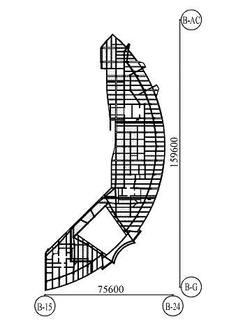 工程盡管設置了3道防震縫,但因功能需要,各單元內樓板還存在開大洞情況,使得樓板有效寬度遠小于該層樓板典型寬度的50%,如單元①在2~5層樓板局部有效寬度在25%左右(其他層樓板連通),見圖5;單元②在2,3層入口大堂處樓板有效寬度為26%(其他層樓板連通),見圖6;單元③在2層入口大堂處樓板有效寬度小于20%(其他層樓板連通),見圖7。