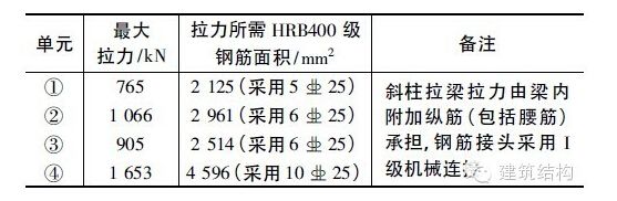 在中震作用下,各單元的斜柱拉梁的拉力及配筋情況見表2。
