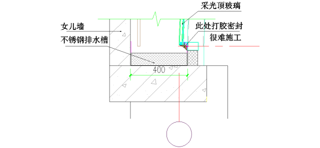 與采光頂接觸的界面可以有很多,如石材、面磚、砂漿抹灰(外刷涂料)、清水混凝土、鋁板、鋁鎂錳合金板、鋼板(排水槽處)、太陽能光電板等;其過渡交接的方式則有平接、搭接、插接等幾種方式。平接是兩種界面分別固定(詞條“固定”由行業大百科提供)在框上,通過密封膠或密封膠條過渡,其特點是順著流水坡度方向平滑順暢。平接過渡方式對設計和施工而言都比較簡單,不易出錯,但對密封膠的施工質量要求比較嚴格。搭接是順著水流方向,一種界面壓住另一種界面,這是一種古老的過渡方式,但遇到新材料時,卻不斷出現設計和施工問題。如圖8所示本人參與審查的某工程采光頂的節點圖。該采光頂的玻璃與金屬屋面板的下層鍍鋅鐵皮搭接,玻璃在上層,且順著水流方向,似乎沒錯。然而設計師卻未考慮到在鍍鋅鐵皮上還有保溫層和鋁鎂錳合金面板,反而玻璃在下面,成為倒排水。所以搭接應遵守的原則是“水往誰流,誰就在下”。并且壓住的面一定是與水接觸的面,切不可中間過度面。而插接方式一般使用在有較大結構應力位置,比如變形縫處,外側仍采用密封膠密封。