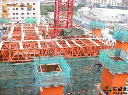 (8)、大型布料機可直接安放在頂模鋼平臺上,材料可大噸位(由鋼筋吊裝點及塔吊吊運力而確定)直接吊運放置到鋼平臺上,頂模系統(tǒng)可方便施工,提高效率,減少塔吊吊次,是爬模等其他類似系統(tǒng)所無法比擬的。