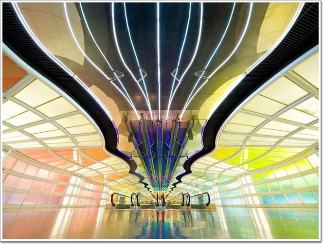 由著名建筑師邁克爾·海登設計建造的這座頗具動態光學設計的聯合航站樓會隨著音樂旋律的變化而呈現不同的顏色。