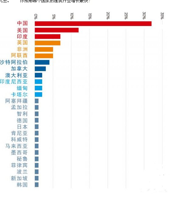 整個行業真正的問題地區——不出意料,顯然是歐洲。預測 英國在2015年有最佳增長的占7%,但是近半數(47%)預測認為未來12個月西歐不會有增長,信心指數低于世界其他任何地區。中歐和東歐的信心指數也好不到哪兒去。 你預期哪個國家的建筑行業增長最快?