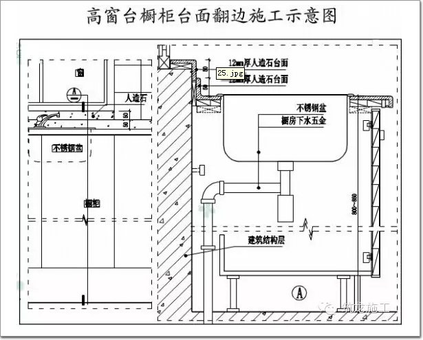 12、高窗臺櫥柜臺面翻邊施工:人造石臺面板與窗臺部位高差大于80mm,人造石臺面擋水外凸,窗臺邊用人造石或廚房面磚跟通。