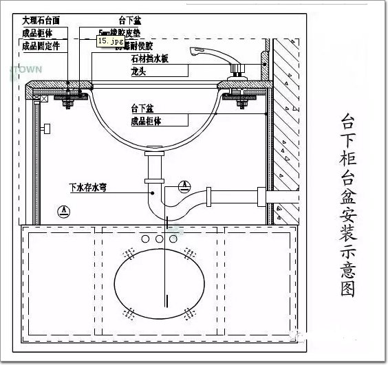 6、臺下柜臺盆安裝:臺盆固定于固定構件上,固定構建與臺下柜基層面8mm對穿螺絲固定,臺盆與固定構件連接處用橡皮墊塊,臺盆與臺面板下沿口用耐候膠密封。
