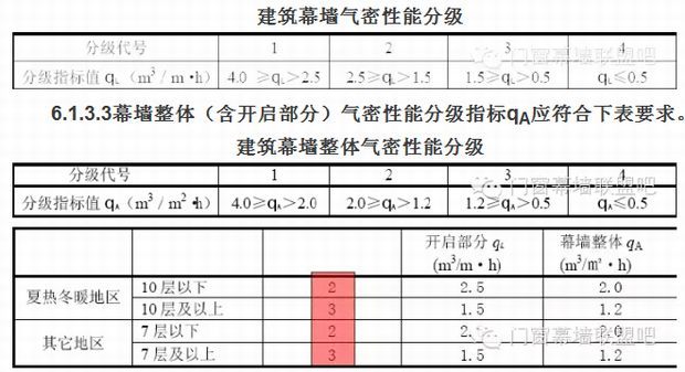 6.1.3.3幕墻整體(含開啟部分)氣密性能分級指標qA應符合下表要求。