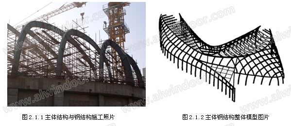 本工程的主體結構是地下2層到地上3層均為鋼筋混凝土結構。3層以上為型鋼曲面鋼結構,彎曲的鋼柱主要是“H”形型鋼,在豎向結構的頂部鋼結構與多榀魚腹式鋼桁架(詞條“鋼桁架”由行業大百科提供)梁連接,按設計要求形成了異形雙曲面鋼結構的殼體,鋼構件之間采用了高強螺栓定位焊接的方案。(如圖2.1.1~2.1.2)