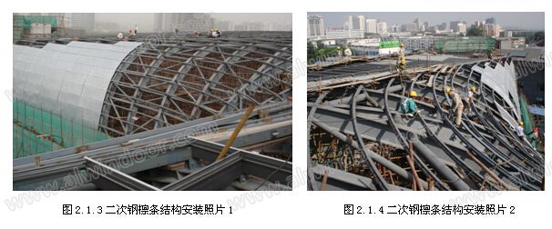2.3.2、防潮層:在金屬屋面的使用過程中,為防止室內潮氣進入玻璃棉,在玻璃棉的下側加貼隔氣、隔潮、反射熱輻射的鋁箔隔氣層,和聚乙烯防潮隔氣層。厚度≮9μm。為防止室外潮氣進入玻璃棉,常在玻璃棉的外側加貼防水透氣膜,起隔潮防潮作用。但在本項目具體施工時考慮到,這樣復雜的雙曲面外形采用防水透氣膜在安裝過程中無法保證其完整性。同時考慮到防水透氣膜是易燃物,在施工過程中容易引起火災,故此取消了采用防水透氣膜的設計。