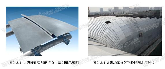 2.3.1、 屋面底板的做法有很多 ,可以用軟防水、用壓型鋼板以及聚安脂硬泡等。但由于本工程的金屬屋面為不規則的雙曲面,這些做法都無法解決雙曲扇形面伸縮變形的問題。采用1.5mm厚的鍍鋅鋼板根據曲面的走向鋪設成硬防水層(如圖2.3.1.1~2.3.1.2)。不但解決了扇形排版問題,同時也為安裝過程中施工人員提供了可靠的安全踏板,避免在施工時損壞下層底板。