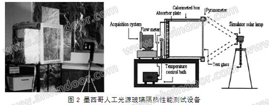 1999年墨西哥國家研究技術發展中心使用1000W鹵鎢燈代替了自然光作為光源,設計了一套實驗裝置,對不同類型的玻璃遮光隔熱性能進行實驗分析,得到了不同類型玻璃的遮陽系數,測試裝置見圖2。