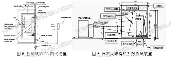 新加坡太陽能研究協會采用18KW金屬鹵素燈作為模擬光源,研制了一套用于測量建筑外窗太陽光的得熱系數的熱計量箱,測試系統見圖5。熱計量箱體是在試件傳熱系數測量箱體基礎上改造的,包括計量箱和防護箱兩部分。