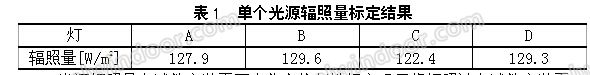 單個光源輻照量標定采用試件安裝平面的中心點作為標定位置進行輻照量測試。經標定,四個燈在試件安裝平面中心位置的輻照量見表1。可以看出,由于采用調節電流控制功率,較好地達到了各個燈較為一致的輻照度,從而達到標準要求的500W/m2±25W/m2輻照值,結果較為理想。