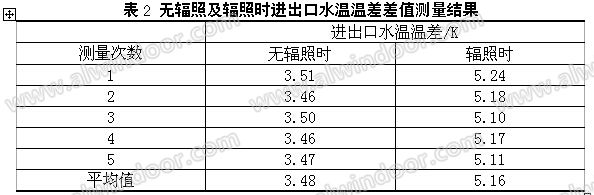 水冷計量系統標定采用上述穩定輻照條件下,外環境箱和計量箱均維持在25℃左右,測定輻照前后水帶走的熱量,比較其與輻照熱量的差異。設定計量箱、防護箱和外環境箱均為25℃,進口水溫為16℃。首先測定無輻照時,進出口水溫溫差;然后輻照約1個小時后,再測量進出口水溫溫差。無輻照時及輻照時進出口水溫溫差差值采用多次測試結果的平均值,見表2。