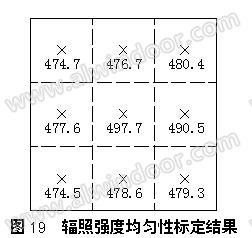 光源輻照量在試件安裝平面內分布均勻性(詞條“均勻性”由行業大百科提供)標定采用將輻照計在試件安裝平面內移動到相應位置進行測試的方法。標定結果見圖19。