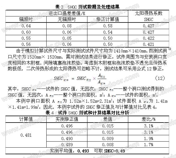 表4可以看出,經修正后的SHGC實測值與計算結果差比在5%以內,具有良好的一致性,則試件的SHGC實測值為0.49。