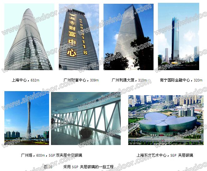 離子型中間膜(商品名稱SGP,最早由美國杜邦公司開發)比常用的PVB膜強度高5倍,抗剪模量(詞條“模量”由行業大百科提供)高50倍,玻璃(詞條“玻璃”由行業大百科提供)破碎后保持較高的剩余承載力,不下垂脫落,有很高的安全性。 夾層后,玻璃的力學性能相當于同厚度的整片玻璃,因此可以減小玻璃厚度,降低玻璃重量。目前已經有許多工程采用了SGP 夾層玻璃(圖26 )。