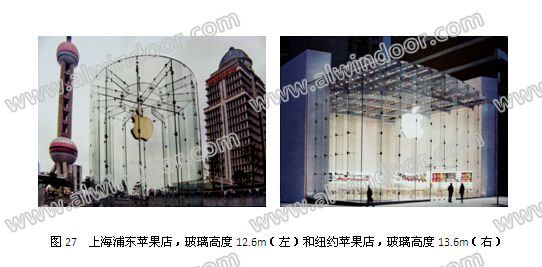 SGP 中間膜還為超大尺寸玻璃的應用提供了條件。我國已生產最大18mX3.6m的超白熱彎鋼化夾層玻璃和6夾層18mX0.8m超高玻璃肋,用于世界各地的蘋果專賣店(圖27)。
