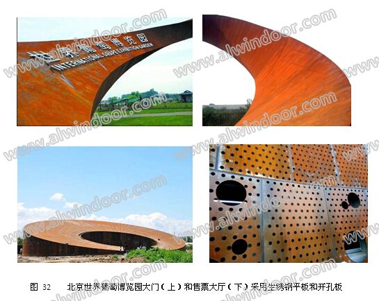 在大家為鋼板防腐問題大傷腦筋的時候,由建筑師卻采用了生銹鋼板作為裝飾面板,別有一種風格。圖32為2004年北京世界葡萄大會博覽園大門和售票大廳墻面采用的生銹鋼板。