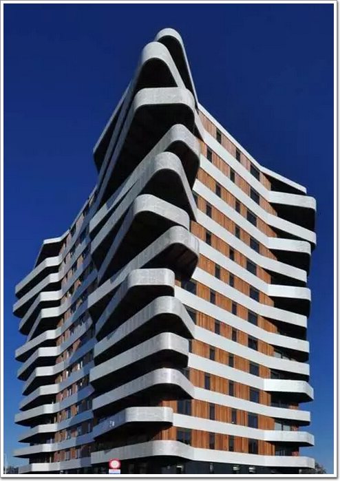 排名第三:扭曲旋轉異形立面。如果不借助3D軟件,一條曲線就可能讓你奔潰。