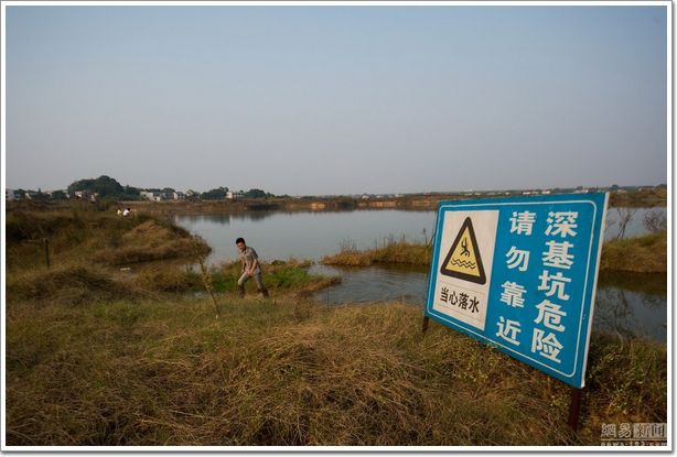 這個基坑是從2013年7月21日開挖,歷時一個多月后停工至今,形成了一個占地約40畝、深達10米的水塘。圖為2014年10月18日,湖南長沙,一名電打魚者到基坑邊洗腳。