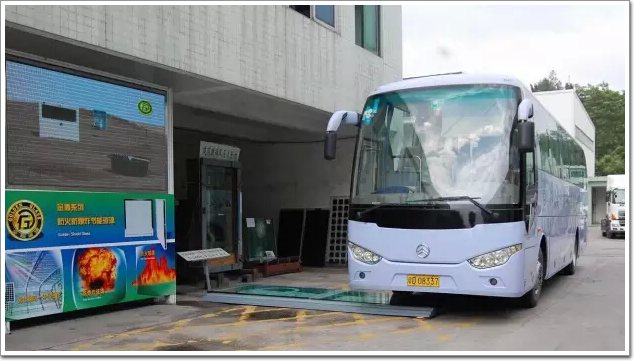 走出車間,來賓首先觀看了汽車壓玻璃試驗。8噸重的大巴從玻璃緩緩駛過,玻璃在輪胎的重壓下雖然彎曲變形但車輛駛過后安然無恙。