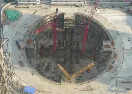 塔樓區圍護采用121m直徑的環形地下連續墻圍護體系,圍護地墻厚1200mm,支撐體系為6道環形圈梁。