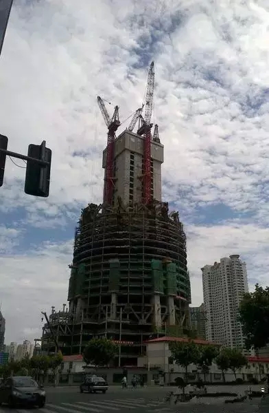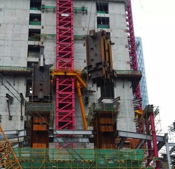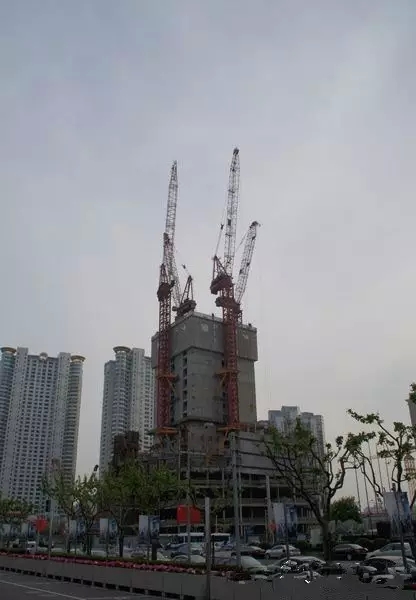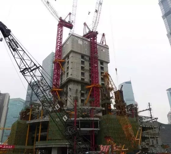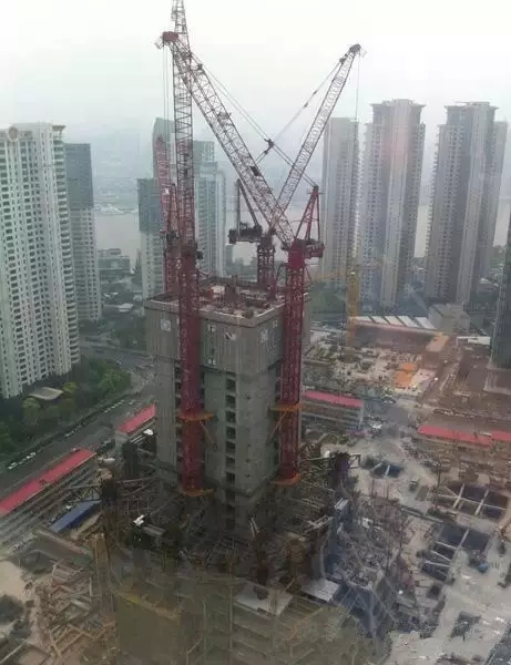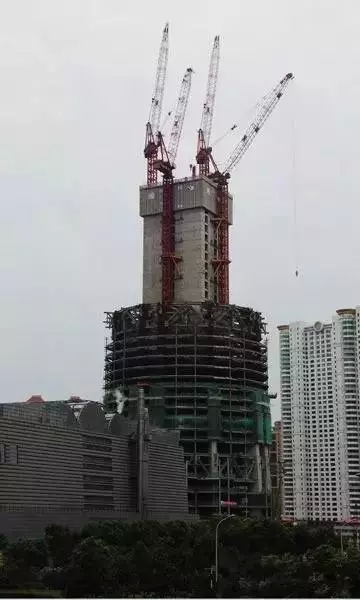 在外圍鋼框架桁架層施工中鋼框架施工節奏較慢,與核心筒的施工距離逐漸加大;在核心筒中的伸臂桁架層施工中核心筒施工節奏較慢;與外圍鋼框架的施工距離逐步減少,如此循環直至主體結構施工至屋頂皇冠底部。