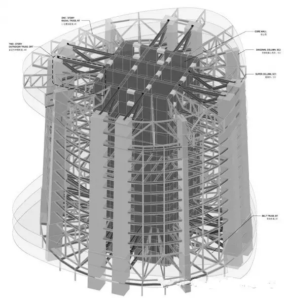 第二個是鋼材料“超級柱”構成的一個環,圍繞鋼筋混凝土芯柱,通過鋼承力支架與之相連。這些鋼柱負責支撐大樓,抵御側力。最后一個是每14層采用一個2層高的帶狀桁架,環抱整座大樓,每一個桁架帶標志著一個新區域的開始。