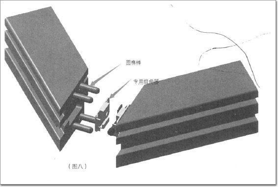 e)為了能實現(xiàn)角部密封的嚴(yán)密性,通過從兩半組角器的垂直擋板中孔洞內(nèi)伸出的緊固螺栓進(jìn)行緊固,以便對應(yīng)型材角部的圓榫棒進(jìn)行完全定位和插入,實現(xiàn)45° 組角完美連接。