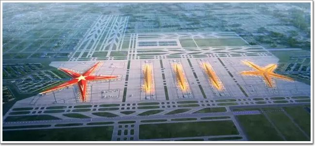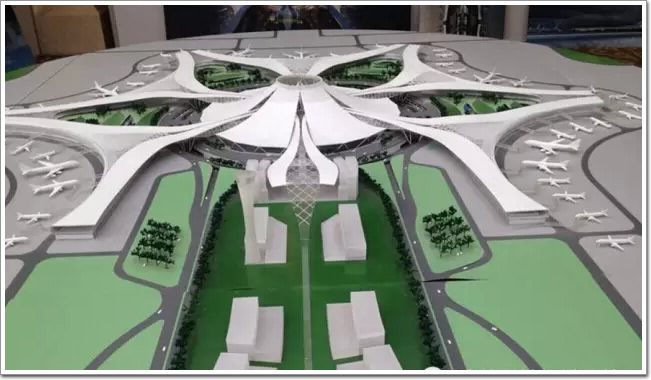 簡直就是五星紅旗迎風飄揚呀,仿佛置身紅色警戒,開啟了共和國之輝的節奏有木有?再來個鐮刀斧頭效果更佳!不過最終這個過程方案沒被采納,我們再看看新機場的沙盤模型吧!