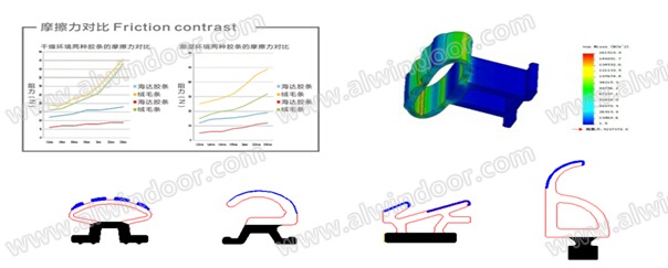 a)推拉門窗的密封完全依靠毛條已解決不了節能要求,推拉門窗密封膠條產品在解決推拉門窗低摩擦和耐久低磨耗,提高氣密、水密、隔音性能的方向發展,產品植絨工藝通常采用纖度在3~4D的聚酯纖維和錦綸纖維,顏色以黑色居多。植絨或噴涂主要應用在推拉門窗和陽光房電動滑窗上,降低推拉摩擦的噪音和磨損,部分產品表面常常要涂覆、噴涂、化學改性(詞條“改性”由行業大百科提供)和靜電植絨。為避免密封膠條生產廠不具備植絨工藝技術,也可選用與低摩擦材料多種材料復合共擠出材料的技術工藝實現。因此,密封膠條復合材料層之間低摩擦材料是不可忽視的條件,決定著密封膠條外觀質量和使用耐久性。密封膠條的配方體系及產品結構工藝已突破了傳統的產品工藝范疇,繼續研發滿足更高要求的密封膠條產品。以下圖例為低摩擦的研發產品結構及摩擦力對照分析: