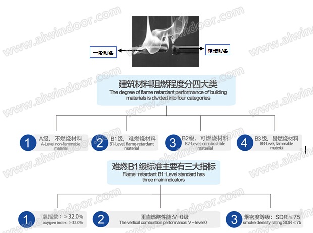 b)建筑門窗作為建筑外圍護結構的安全性能一直以來都受到普遍關注。《建筑設計防火規范》GB50016-2014中對建筑的外門外窗提出的耐火完整性要求,引起了行業的普遍關注。目前我國沒有建筑門窗的耐火完整性檢測方法標準,也沒有相關密封膠條阻燃產品性能要求。為實現其產品達到阻然性能要求必須結合其他產品相關阻然性要求:密封膠條要有環保性,除了生產的節能之外,還要有使用時的阻燃性,針對難燃B1級標準主要有三大指標要求可相互結合,滿足窗戶的啟閉、密封、節能、阻然、回彈各項性能指標,配合使用遇火膨脹密封膠條結構。結合各種密封材料具備的特性,打破以往防火門(詞條“防火門”由行業大百科提供)只為滿足燃燒試驗選用不具備彈性節能密封的硬膠皮的結構,希望我們共同攜手推進節能住宅性能認定制度,提高住宅的實用、環境、經濟、安全和耐久性能,讓我們還老百姓真正的滿足各項性能指標的節能窗戶。以下圖例為阻燃膠(詞條“阻燃膠”由行業大百科提供)條燃燒對照及阻燃類別、指標參照: