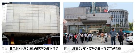 振動臺試驗表明,短槽連接的石材幕墻可以承受9度地震的作用。2008年汶川大地震中,短槽連接的石材幕墻表現良好,按7度抗震設計的石材幕墻基本上經受了9度地震的考驗,沒有發生明顯的地震震害,不僅支承結構完好無損,甚至石材面板都能保持完好(圖3)。