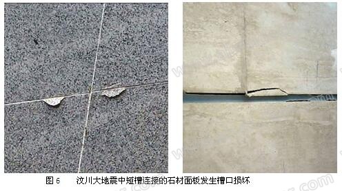 同樣,在汶川地震中,石材幕墻總體表現良好,但個別短槽連接的板塊發生了槽口掰開的破損(圖6)。