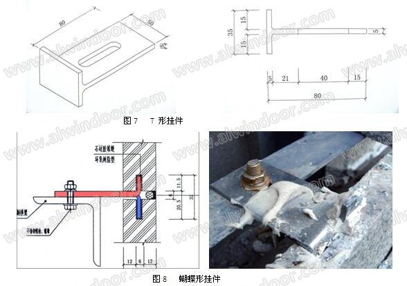 短槽槽口發生破損的原因,除了短槽連接本身相對抗震(詞條“抗震”由行業大百科提供)性能較弱以外,更主要的是因為這些板塊采用了T形掛件或蝴蝶形掛件(圖7)。這兩類掛件性質相同,統稱T型掛件。