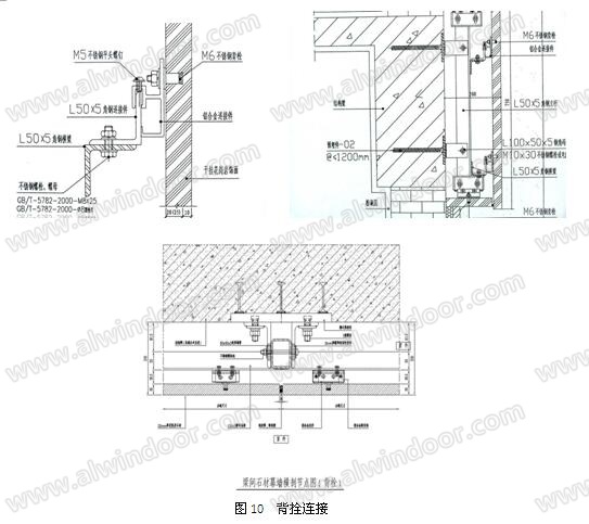 背拴連接可以用于各種類型的石材面板。高度1 00m以下的花崗石幕墻推薦使用背拴連接,高度100m以上的花崗石幕墻應采用背拴連接;非花崗石幕墻應采用背拴連接。