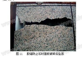 深圳公路大廈石材幕墻,讓工人用大錘擊碎石板,除直接敲碎的部分外,周邊大部分石塊沒有掉下(圖11)。
