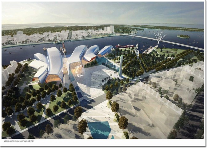 國家海洋博物館位于天津濱海新區,占地面積30萬平方米,設計范圍東西長約2.8公里,水面南北寬330-600米,綠地面積約66公頃,總水面面積約79公頃。國家海洋博物館項目的設計靈感來源于“張開的手掌、海星、鯉魚、海葵、港口中的船只、白色珊瑚殼”等與江河湖海有著密切聯系的事物。