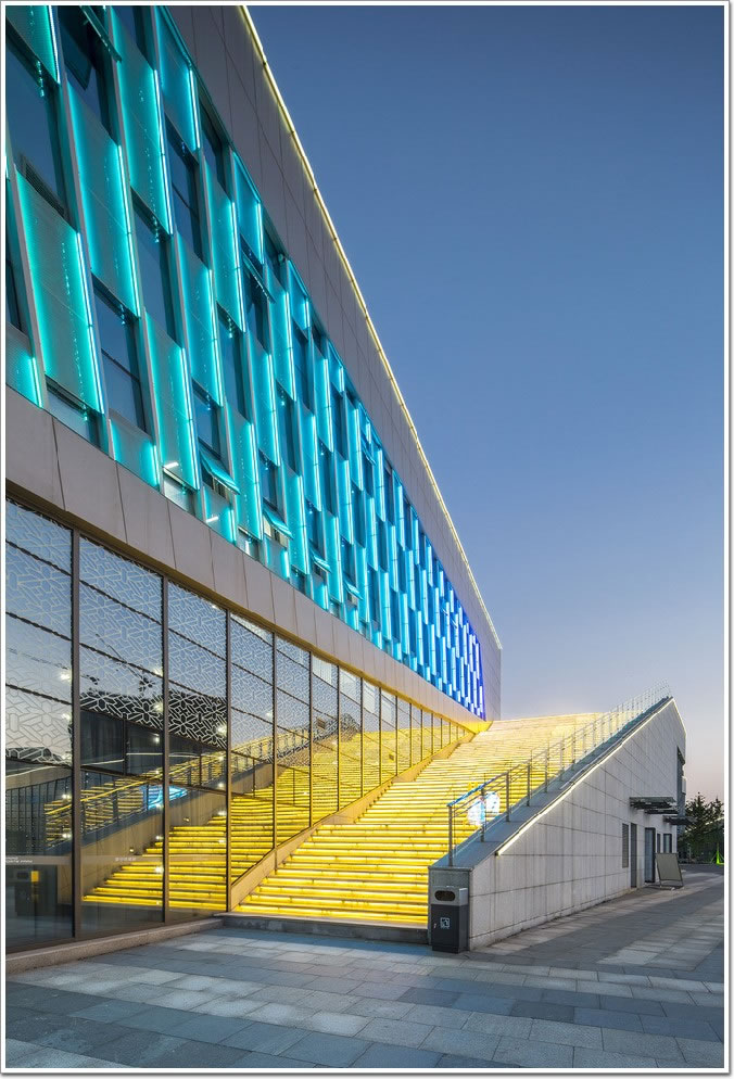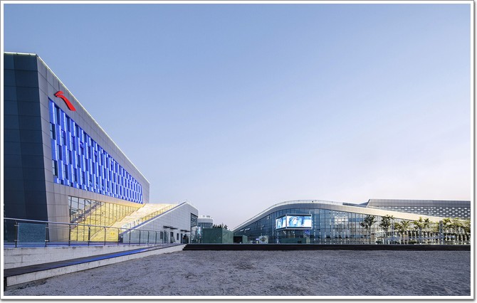 除了表現它的建筑性格和體育性格之外,規劃設計還嘗試引入一些揚州本地的文化特質,如尺度上的把控和與自然的聯系。在尺度上,常規的場館都是很大的空間,而揚州李寧體育園的場館,特別采用了化整為零的處理手法,把傳統的一個大場館分成幾個小的場館,這使得它們運作起來更靈活。另外場館之間因此而形成了很多內部庭院,每個場館各有特點,外立面裝飾有鋁板幕墻、玻璃幕墻、石材幕墻等,而大量的運用玻璃幕墻也讓室內的活動與室外的光線、景致有更好的互動。