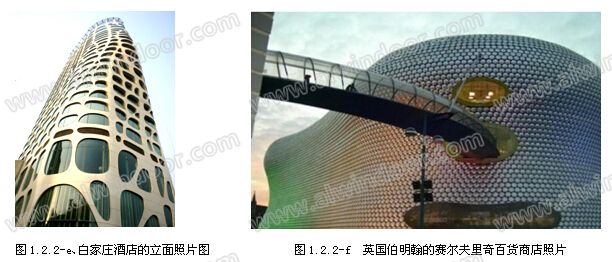 (2)、在法國巴黎香榭麗舍大街精品店的外墻玻璃裝飾面上,采用了螺旋鋼管做空間造形,同時支承自由曲面造型的玻璃面板,使之形成三維空間抽象的外墻玻璃裝飾面。(如圖2.3.2-e、f)