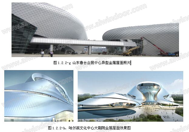 山東魯臺會展中心異型幕墻(詞條“異型幕墻”由行業大百科提供)、金屬屋面的外裝飾板,是典型的菱形拼接面。是采用形狀與大小基本相當的3mm厚菱形鋁合金板塊拼接成的曲面。該項目采用了平板和曲面板的有機組合,確保了曲面造型順滑,保證了建筑的外視效果(如圖1.2.2-g)。