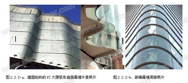 (1)、德國柏林的PC大廈是一個典型的采用單曲面夾膠玻璃進行塑造建筑效果的外裝飾幕墻。建筑師采用了生硬的水泥柱和曲面斜置的玻璃裙之間強烈的對比給人以很大的視覺沖擊來實現這個建筑的個性化。(如圖2.2.2-a、b)